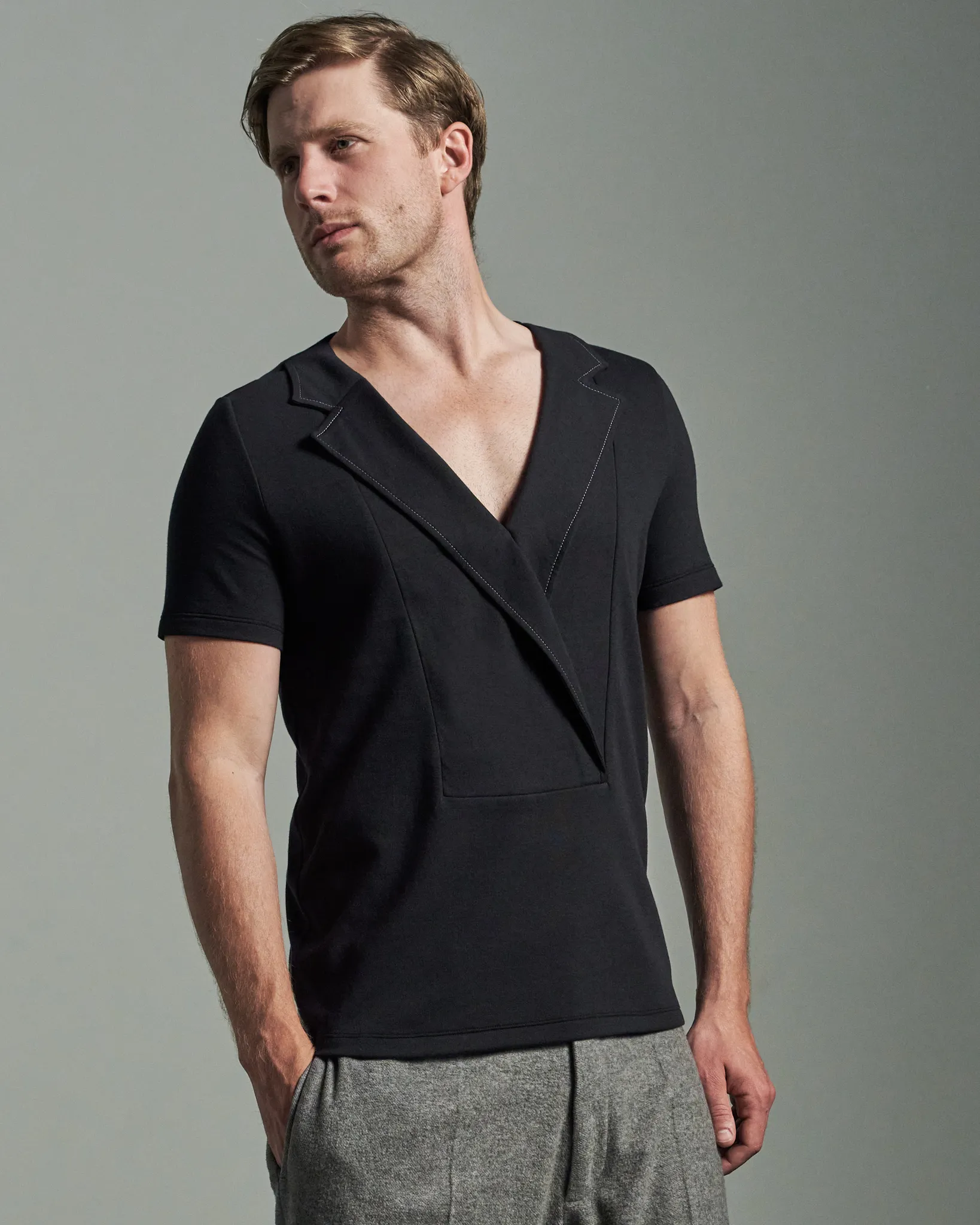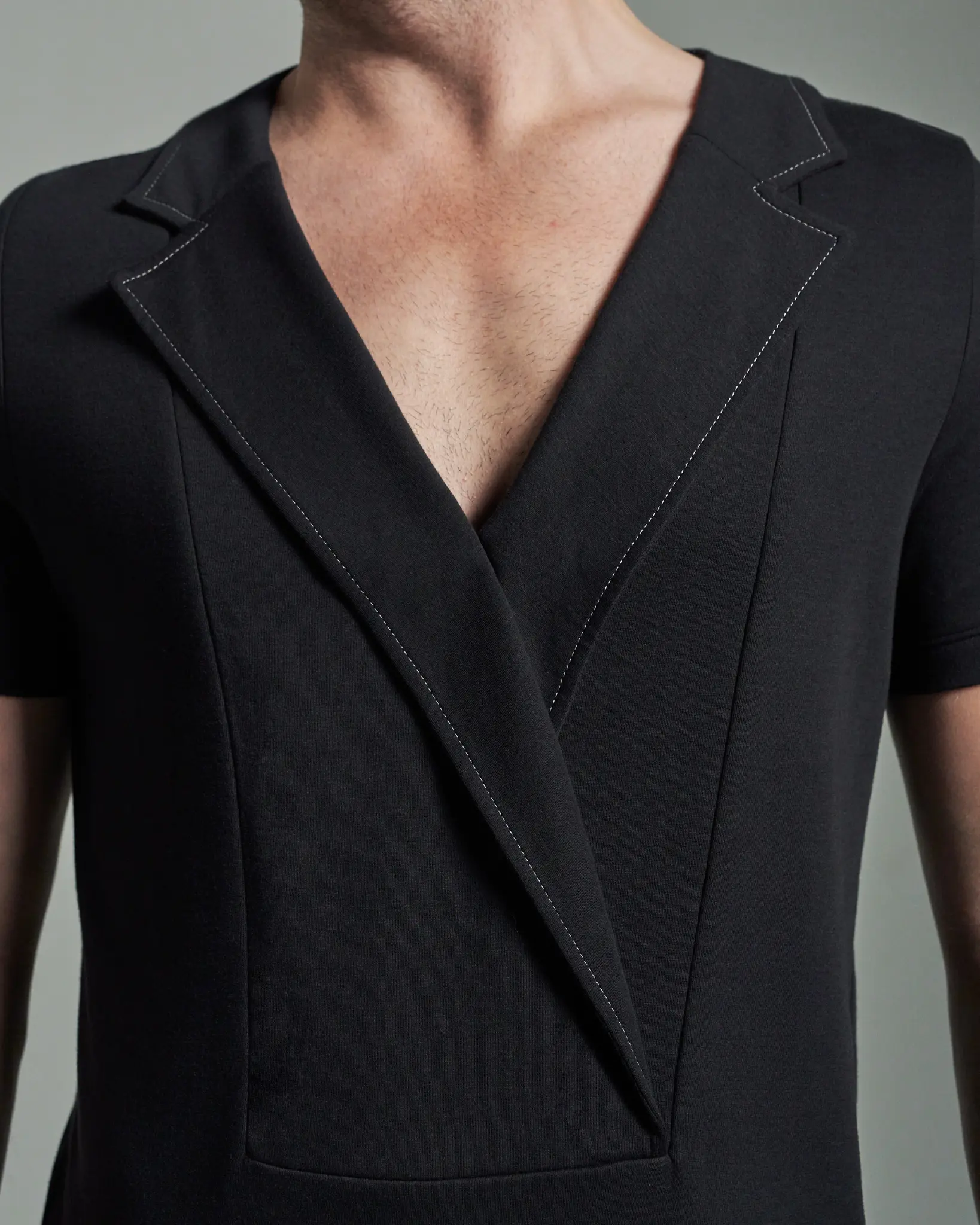 The W. Rubens style 0009.1 T-shirt is a striking representation of bespoke quality and refined design. Featuring Deep Fronted Bib with Asymmetric Lapels & Contrast Stitching. This black slim-fit T-shirt combines the best of traditional craftsmanship with contemporary style. Made with precision in our London atelier, the W. Rubens style 0009.1 ensures a distinguished and polished look for any setting.