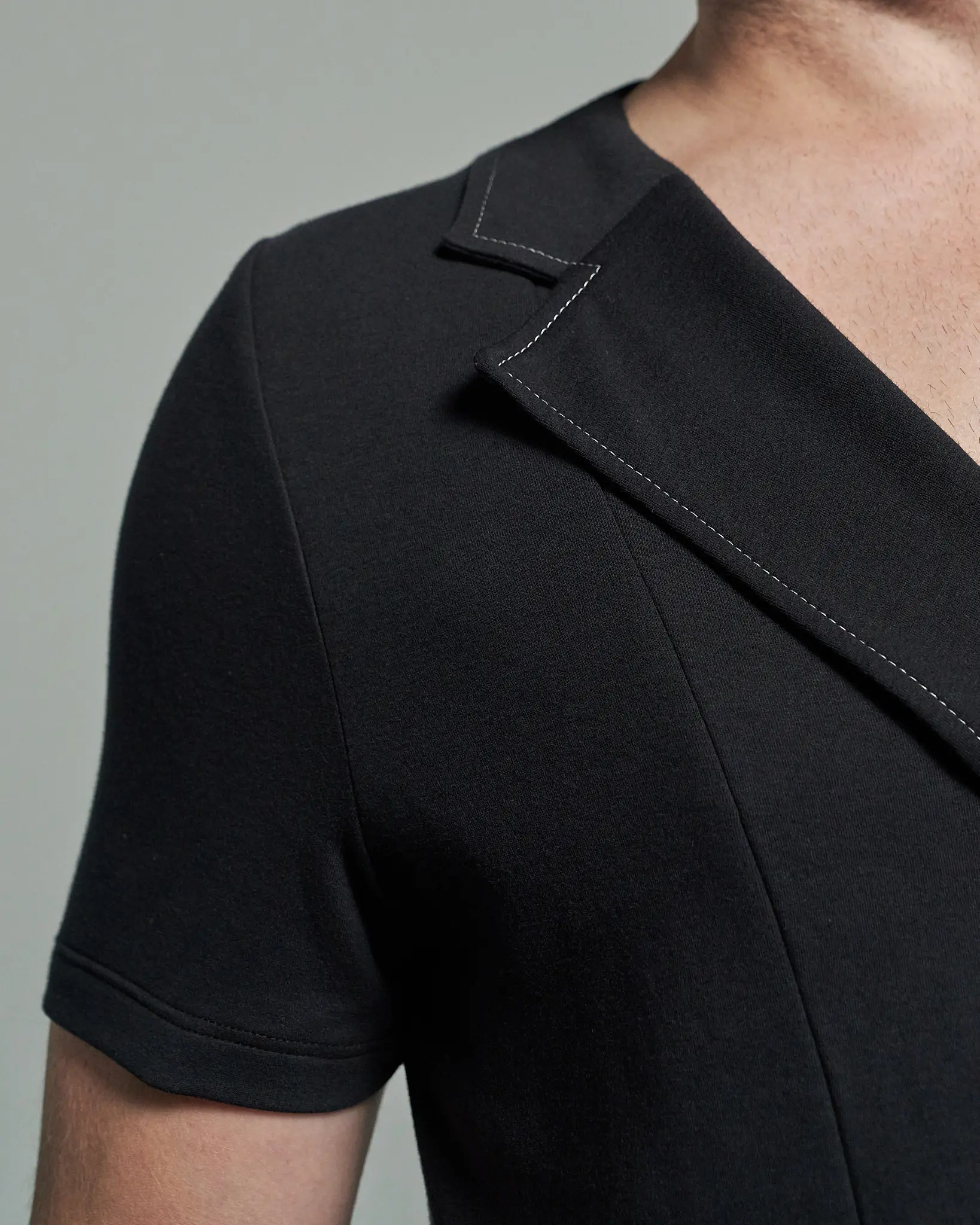 - Back detail with contrast grey stitching, angled vents, and short sleeves for an elegant finish.