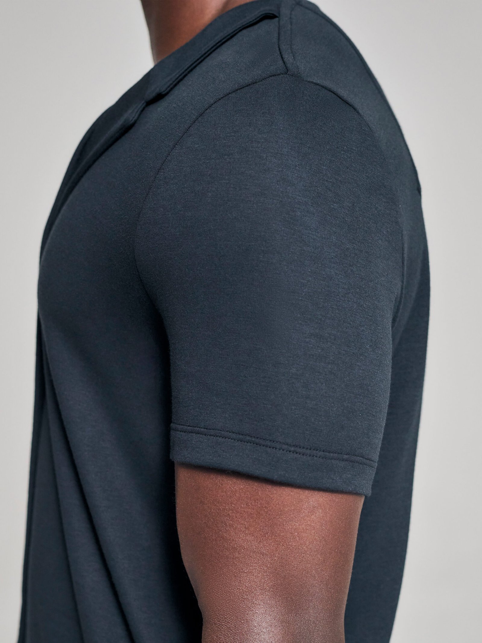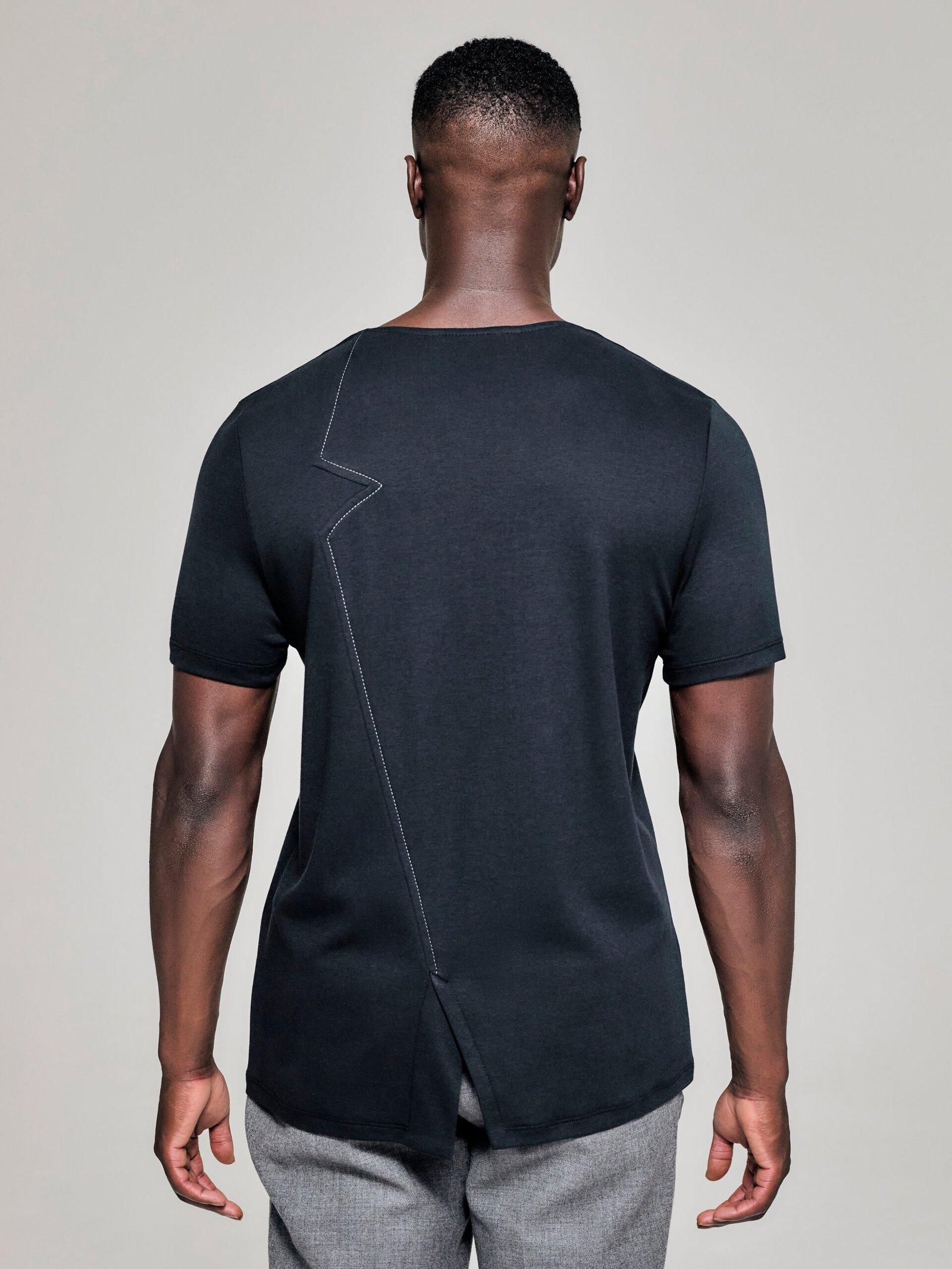 - Back detail with contrast grey stitching, angled vents, and short sleeves, combining elegance with functional design.