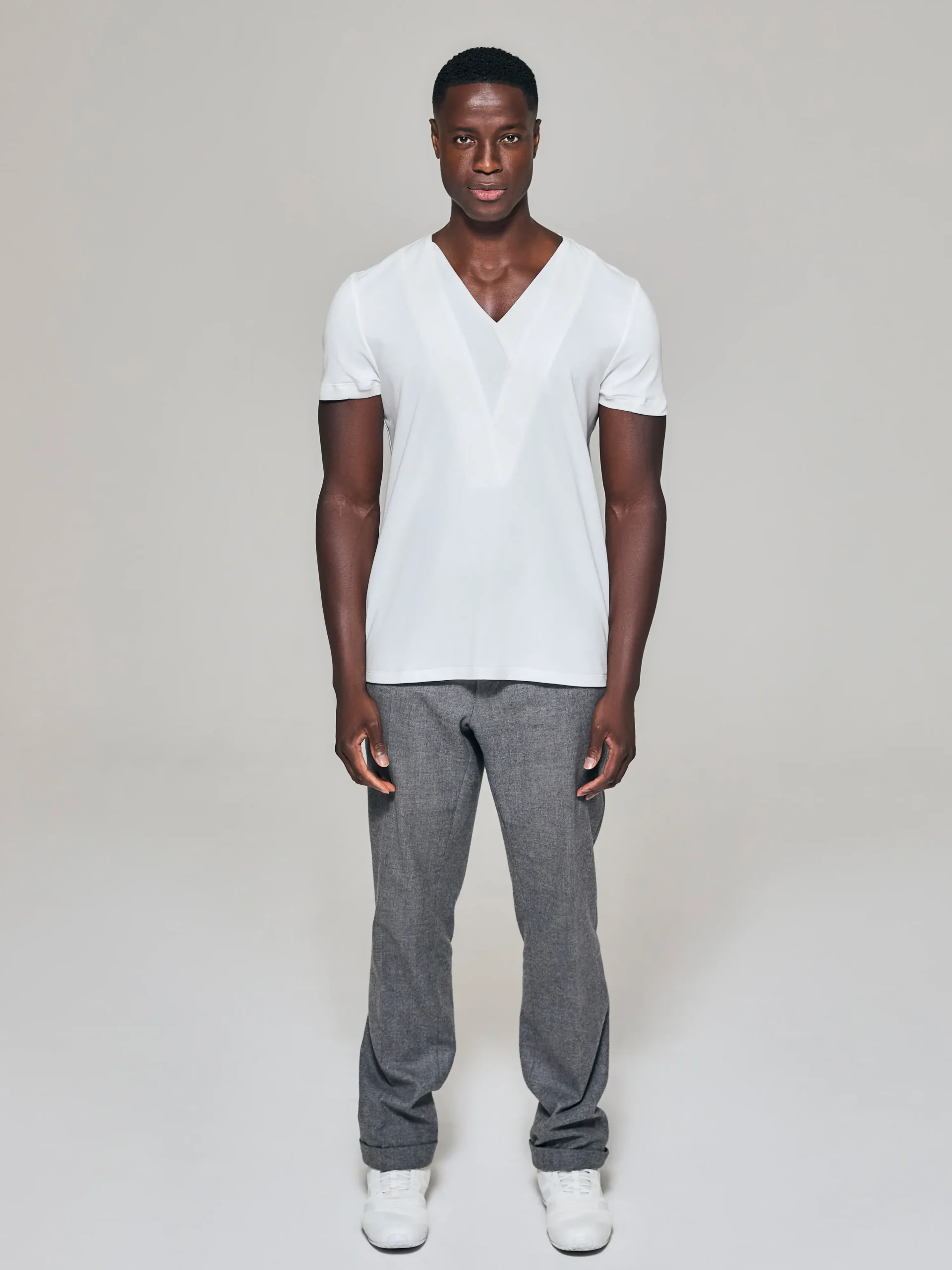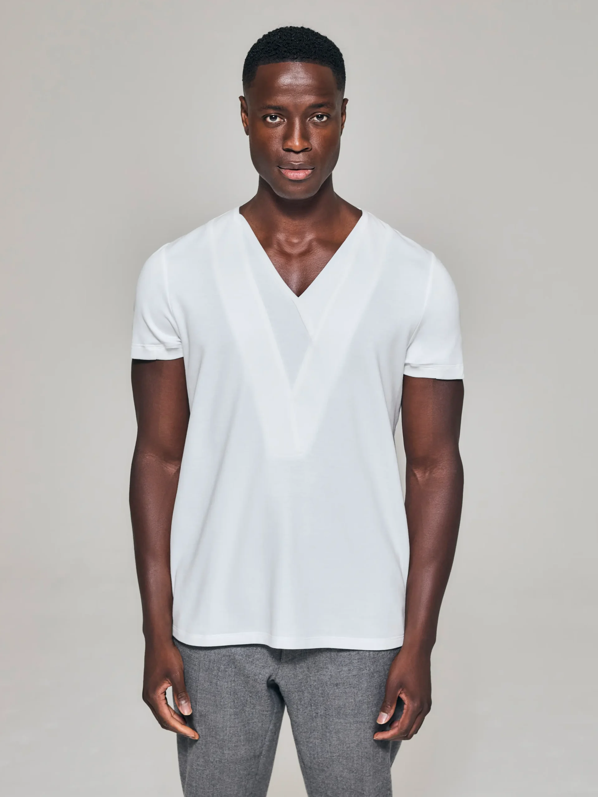 - Bib-fronted V-neck with elegantly layered lapels, introducing refined dimensionality and structure.