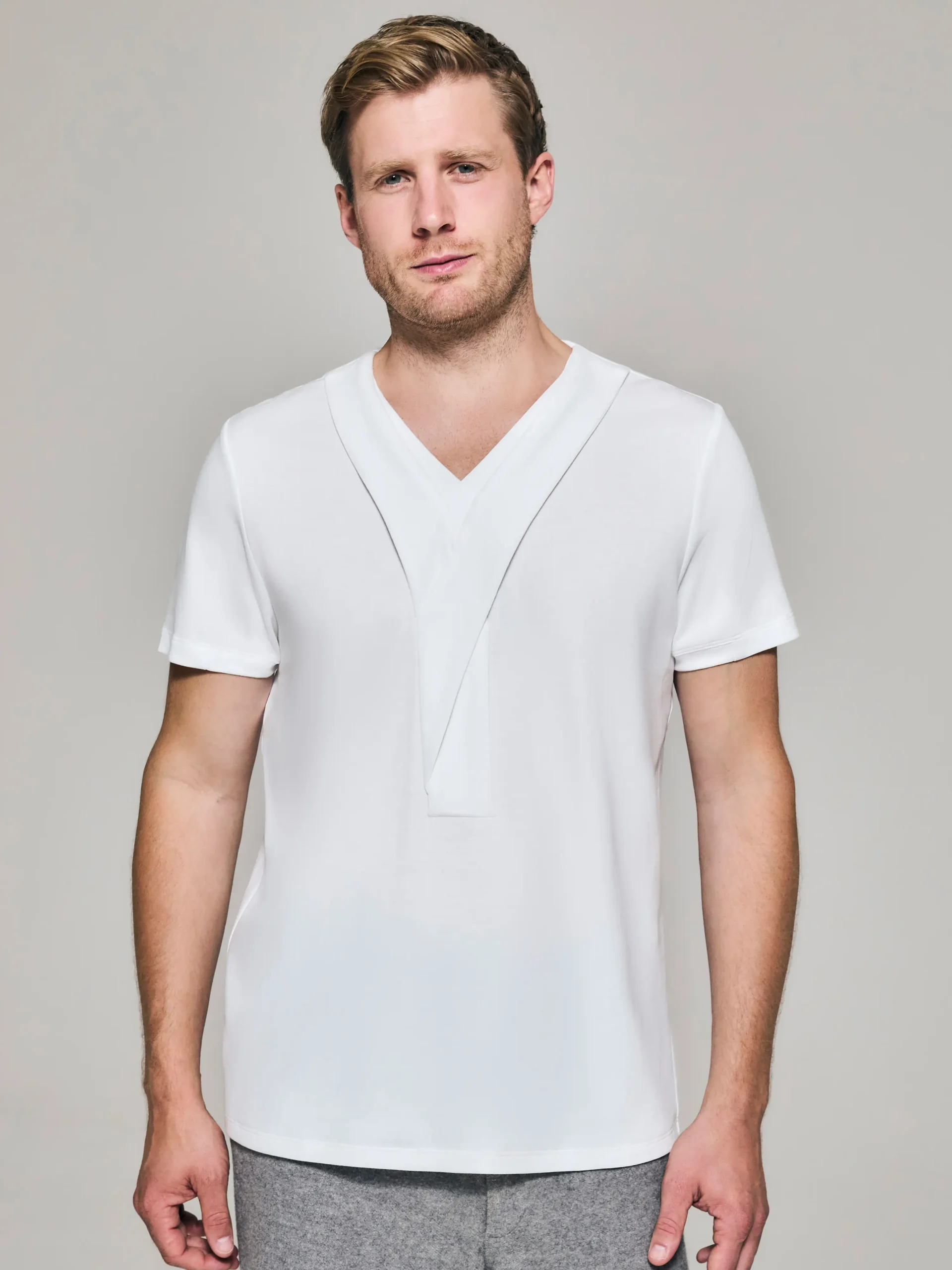 - V-neck with double criss-cross necktie panel, layering precision for an avant-garde effect.