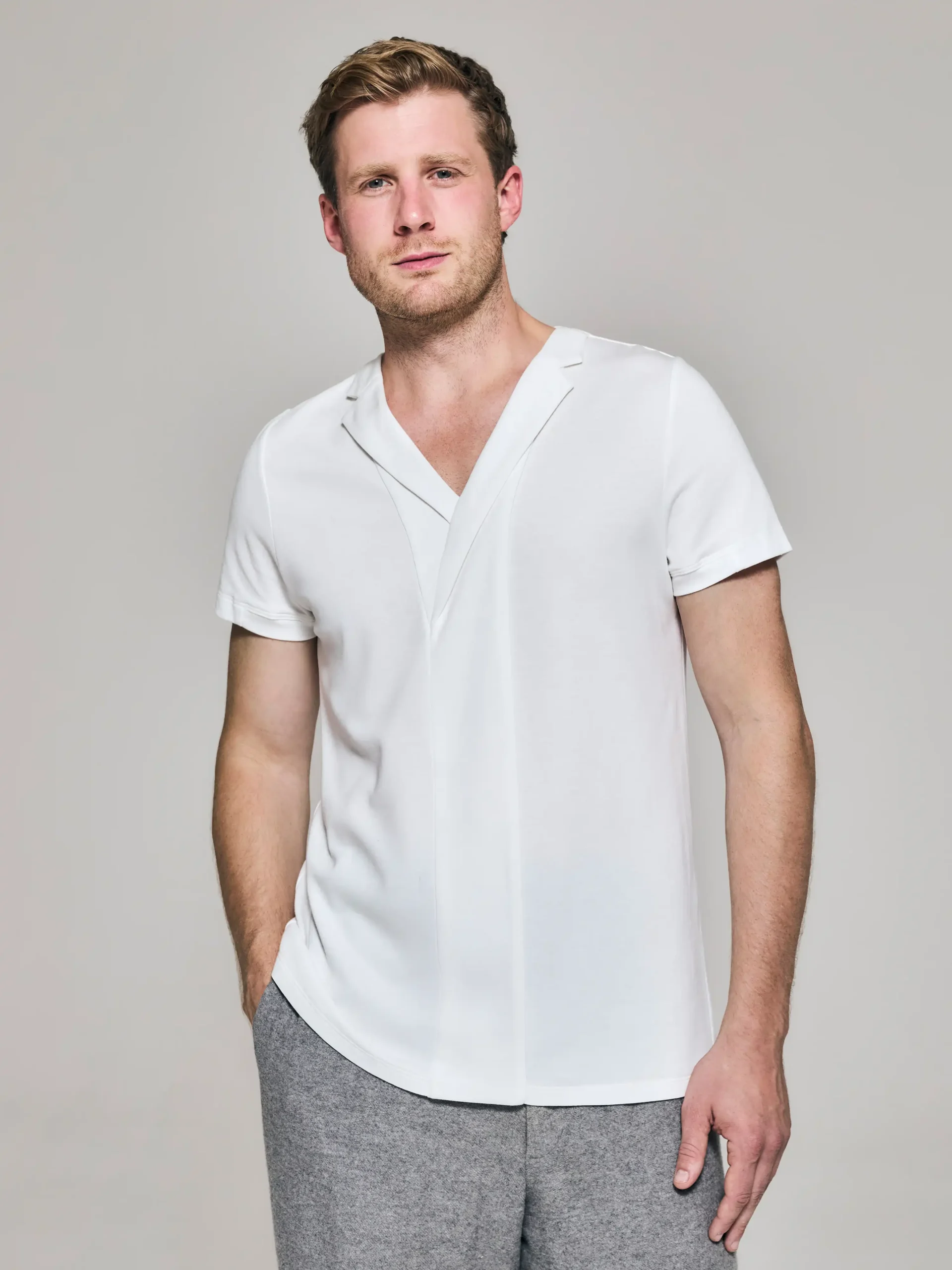 - Front body panel with asymmetric lapels, introducing understated, gentlemanly nuance.